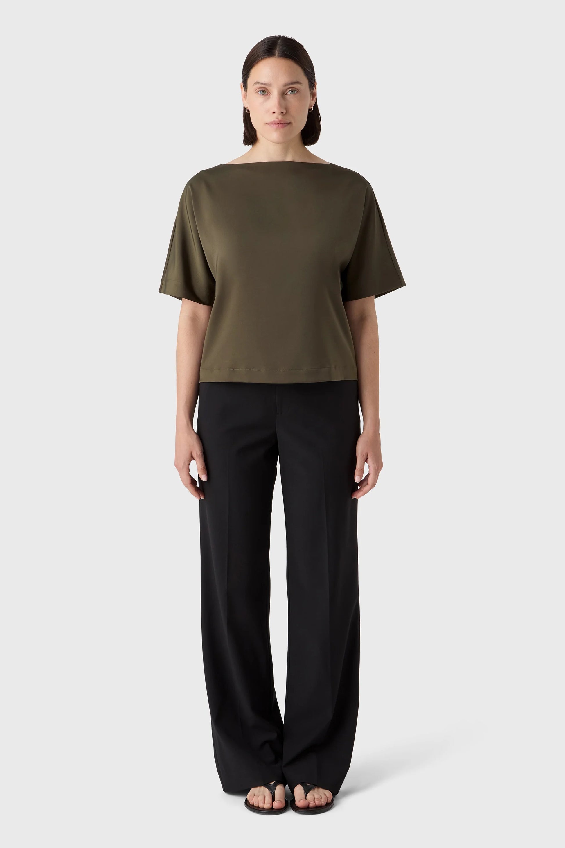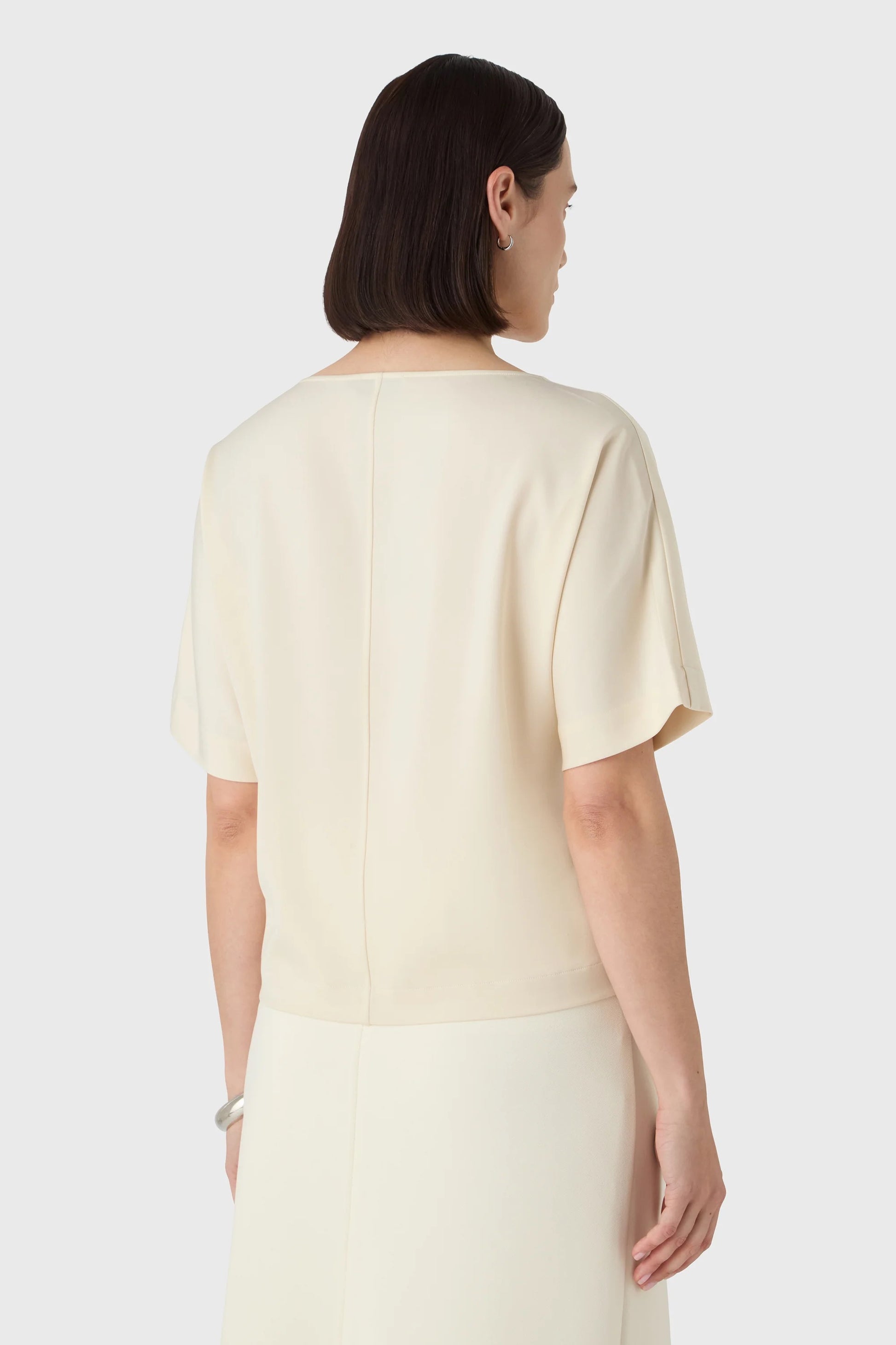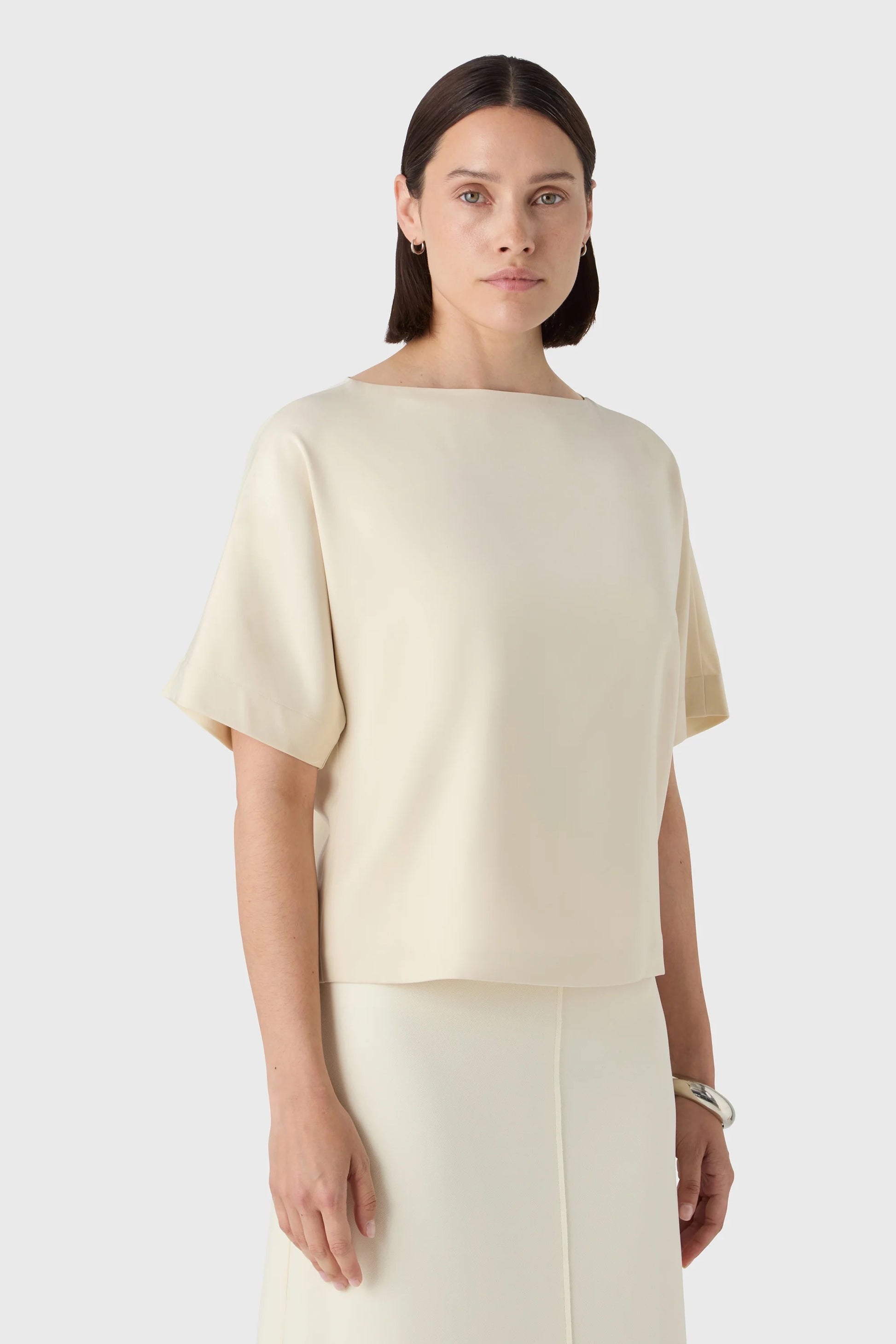 Ava-toppen har en rak silhuett, båtringad hals och kort ärm – sydd i stretchig satin som ger fint fall. Lika fin instoppad som lös för en avslappnat klädd look.
