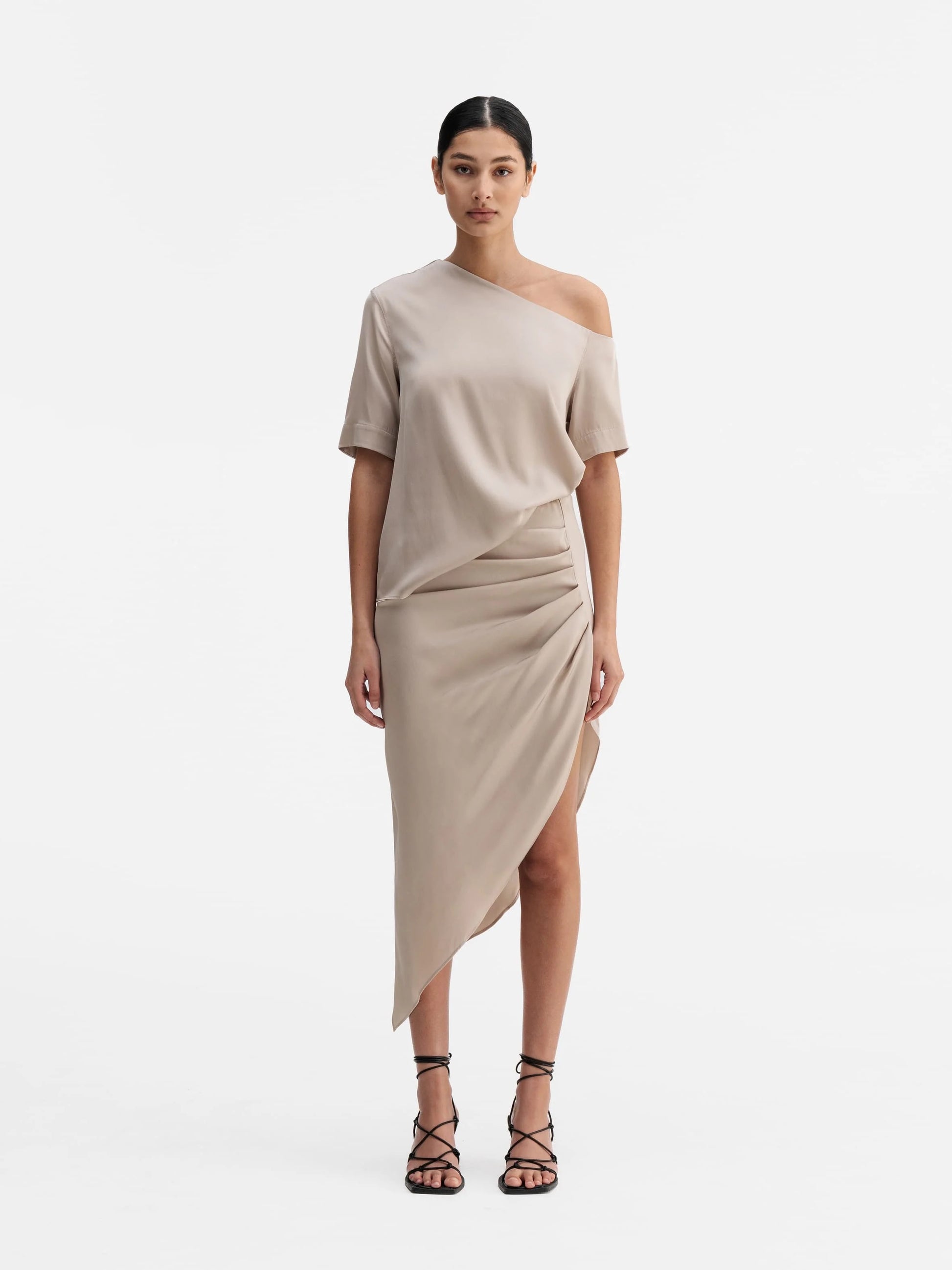 Chima-blusen är tillverkad av vår klassiska siden/stretch och har den karaktäristiska off-shoulder-skärningen, accentuerad av en broderad söm längs ryggen. Den passar enkelt med vilken nederdel som helst för kvällskläder.