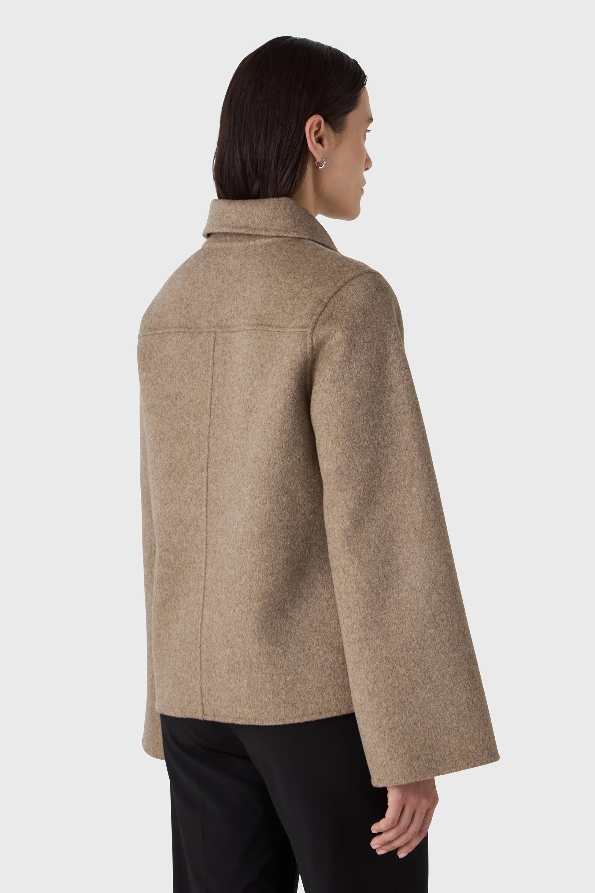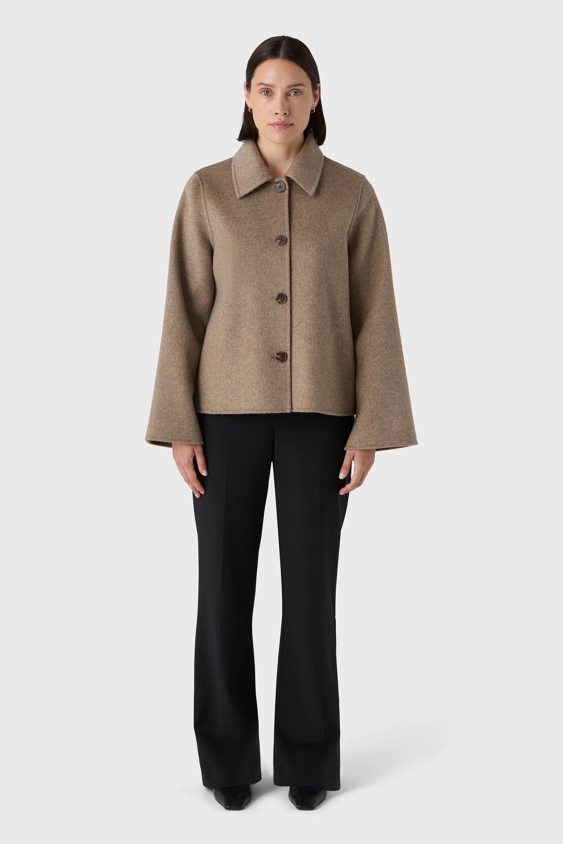 Coline-jackan är sydd i 100 % ull och har en kort, boxig passform med breda ärmar, skjortkrage och ton-i-ton-knappar i horn. En modern och värmande lager-på-lager-jacka med stilren attityd.