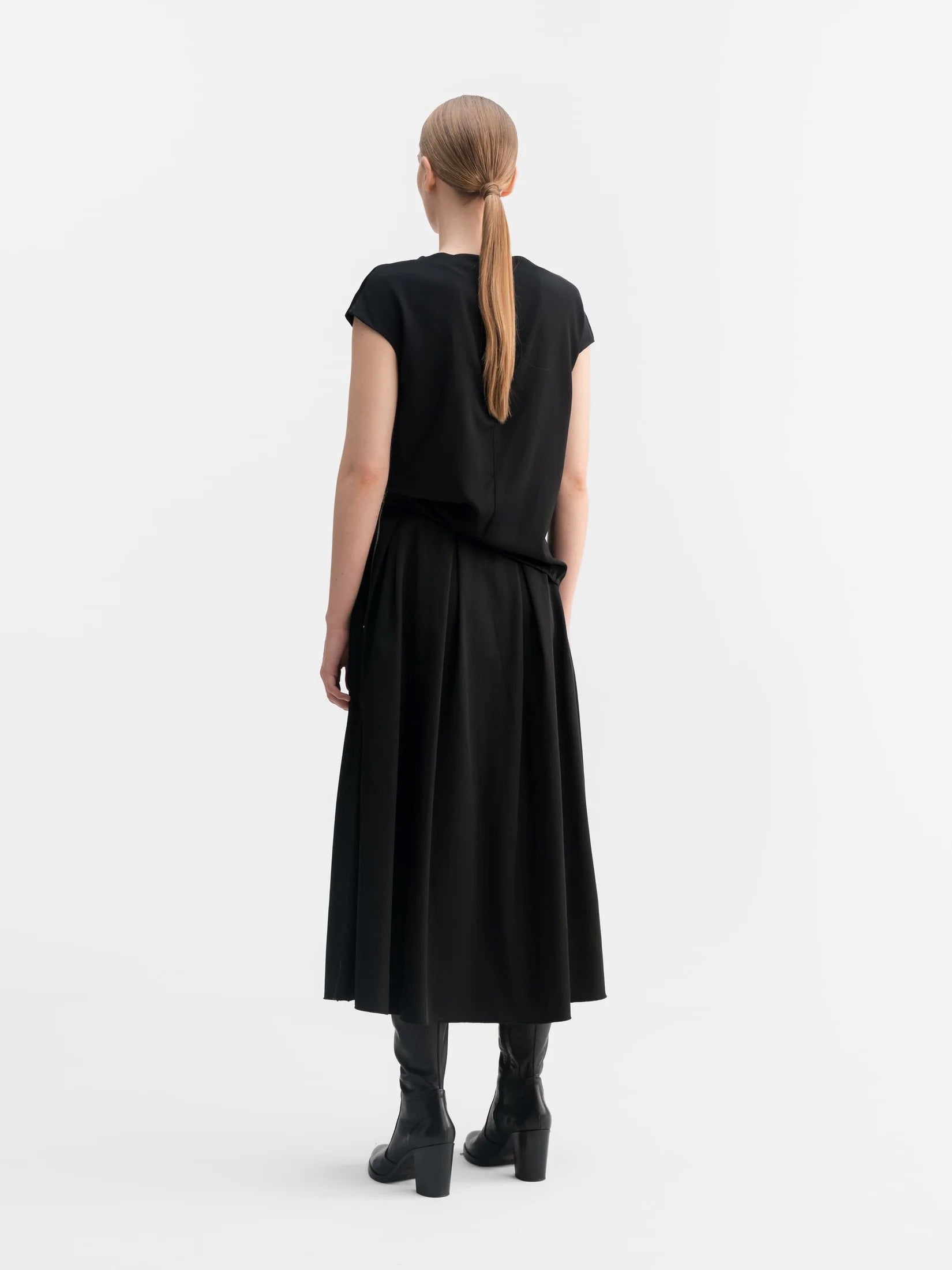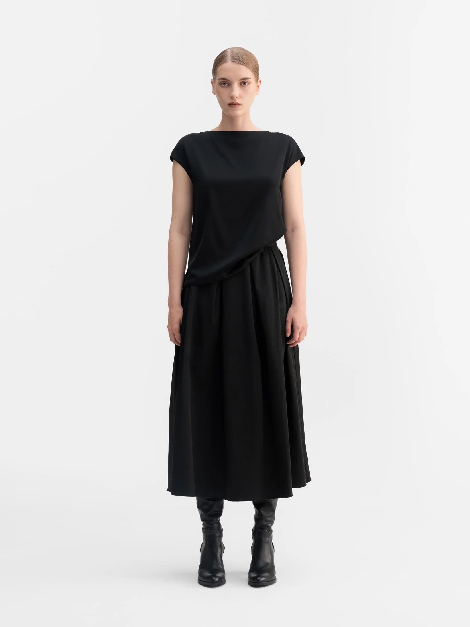 Yui-toppen är skuren i vår klassiska siden/stretch och har en ren båtringning och holkärmar. Hela framsidan är dubbelskiktad och en synlig metallisk dragkedja finns mitt bak. Kombinera med vilken nederdel som helst, året runt.