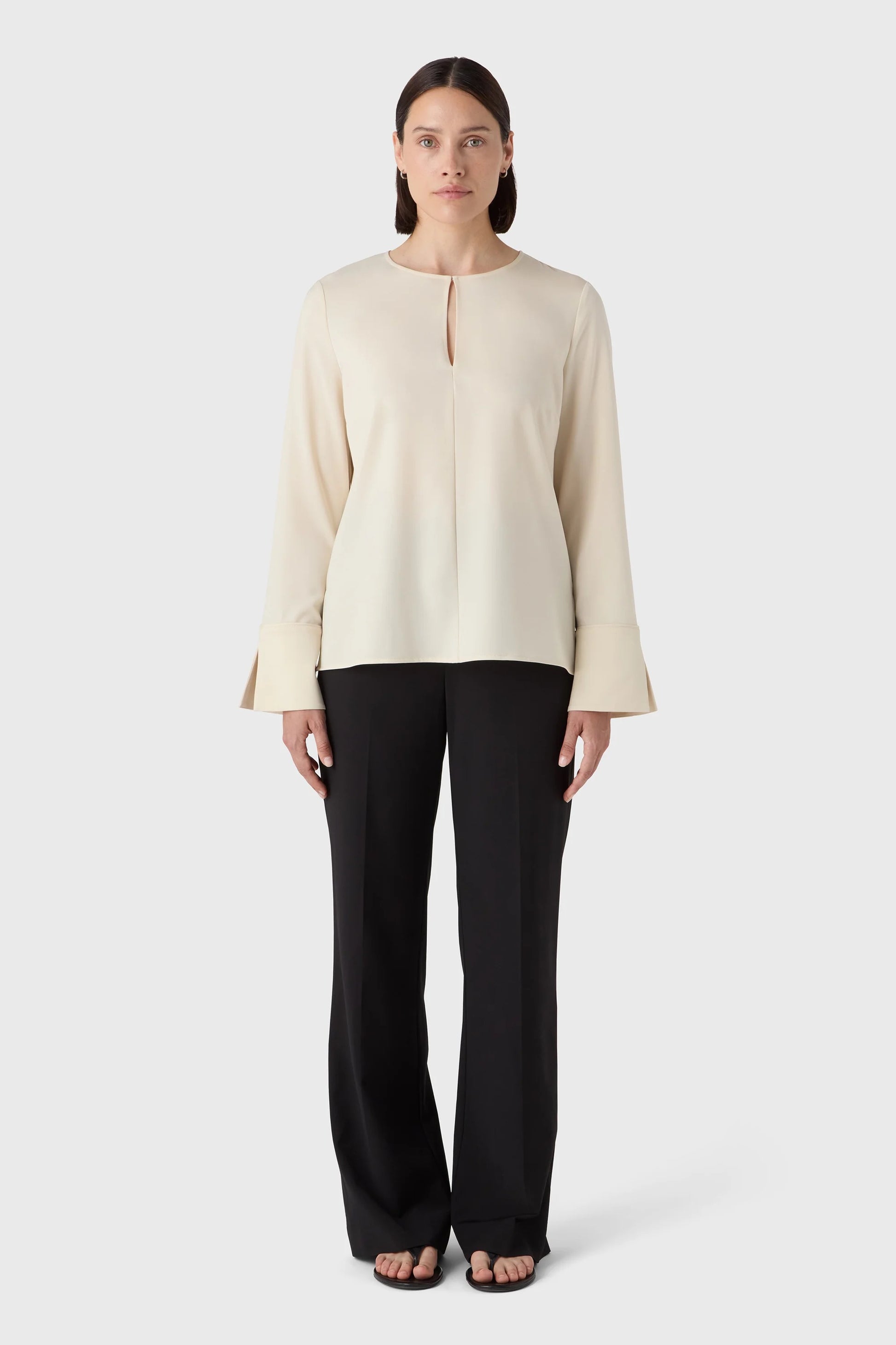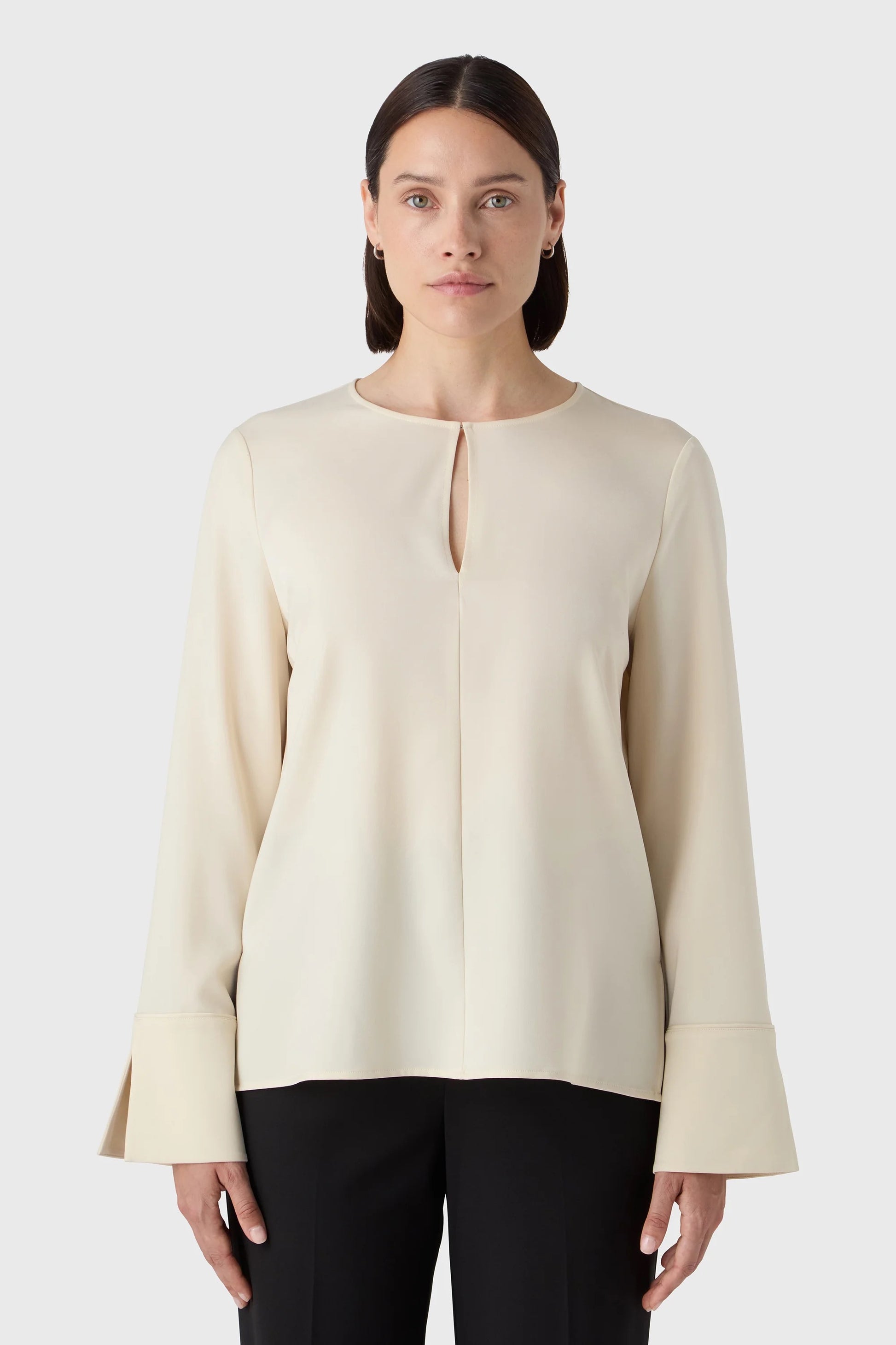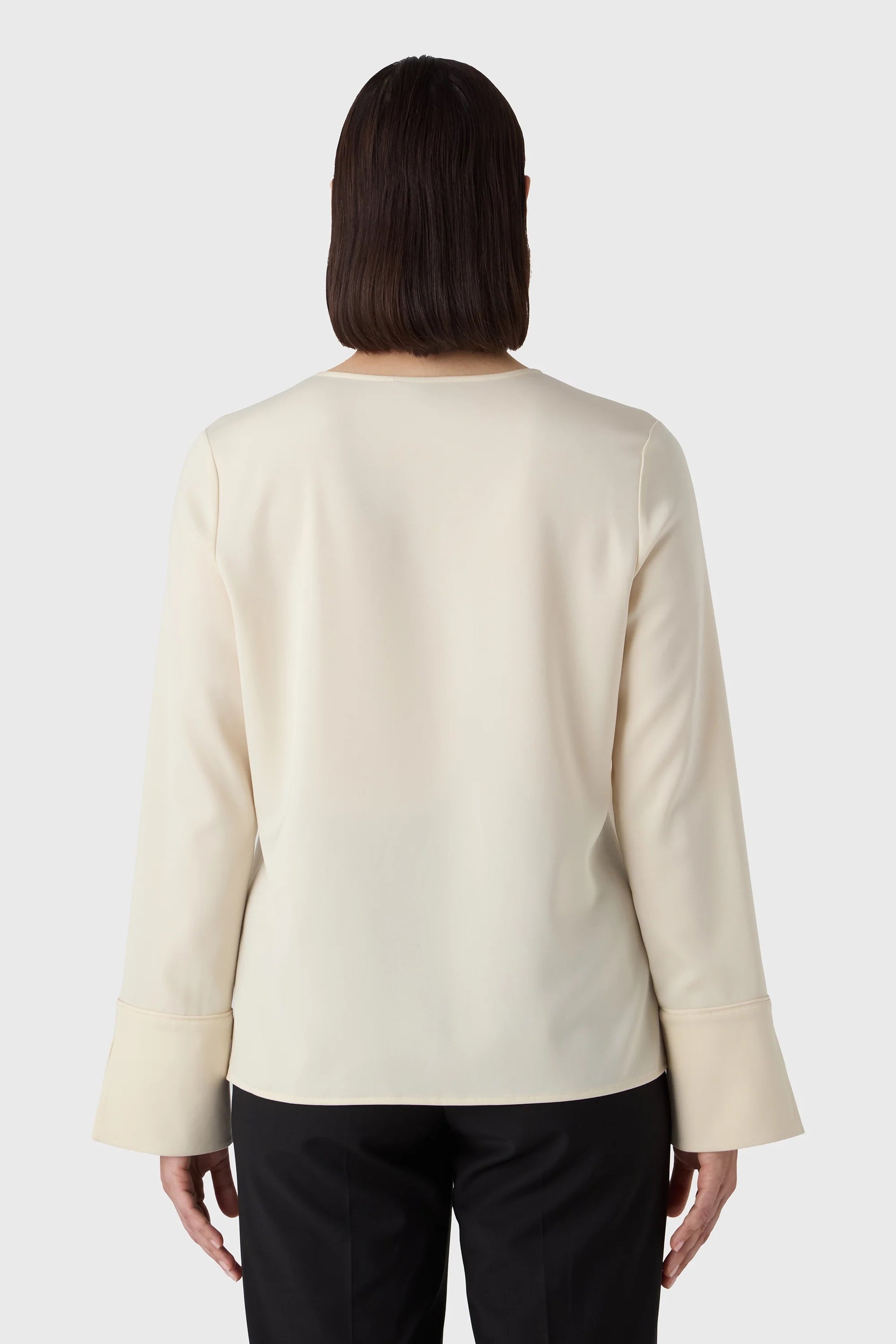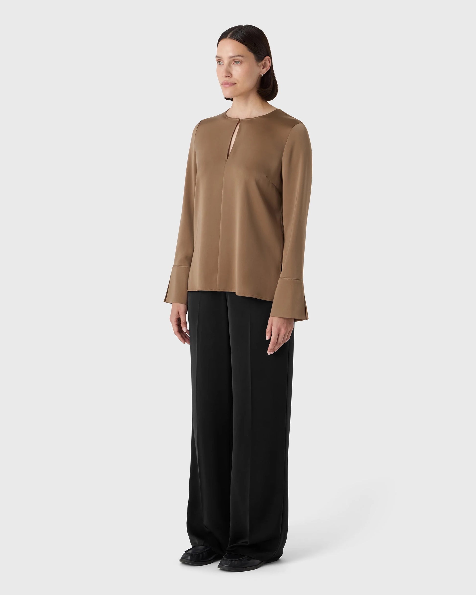 Angela-blusen är sydd i stretchig satin med ett fint fall och har rund halsringning med en feminin sprunddetalj framtill. De diskreta manschetterna ger blusen en lätt skräddad känsla som gör sig lika bra på kontoret som till avslappnade middagar. Bär den instoppad i byxor eller utanför för en mer ledig silhuett.