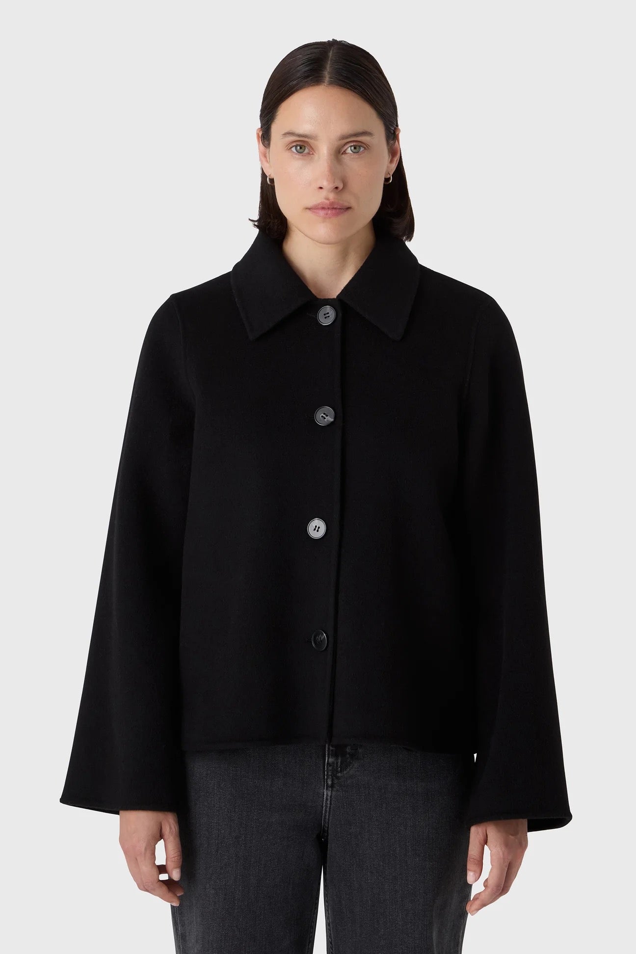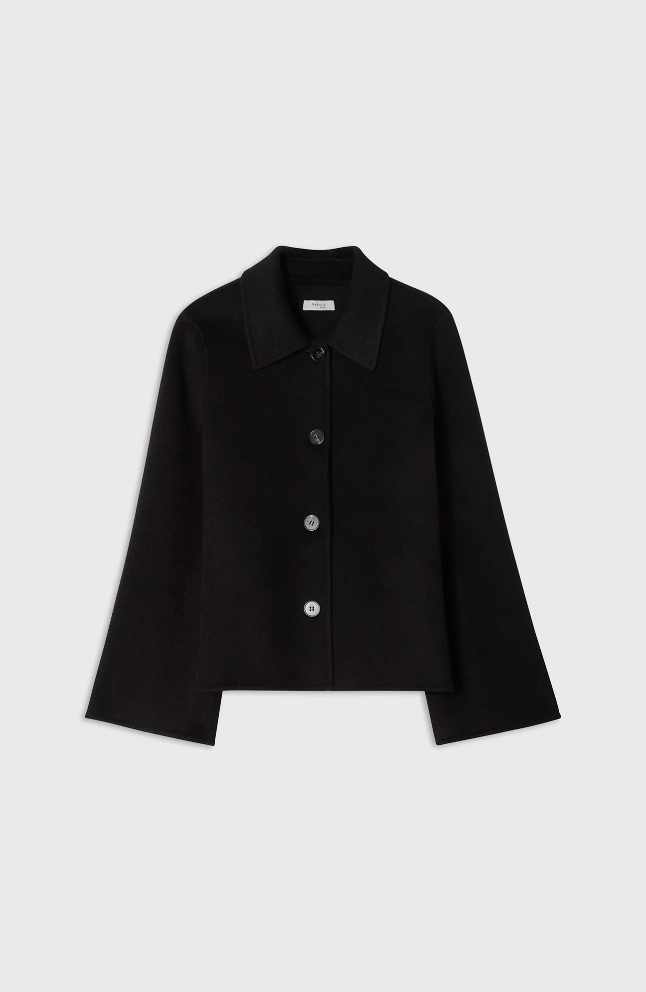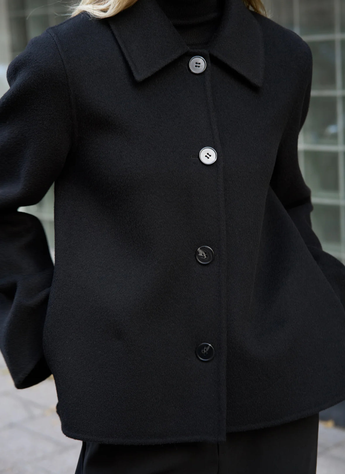 Coline-jackan är sydd i 100 % ull och har en kort, boxig passform med breda ärmar, skjortkrage och ton-i-ton-knappar i horn. En modern och värmande lager-på-lager-jacka med stilren attityd.