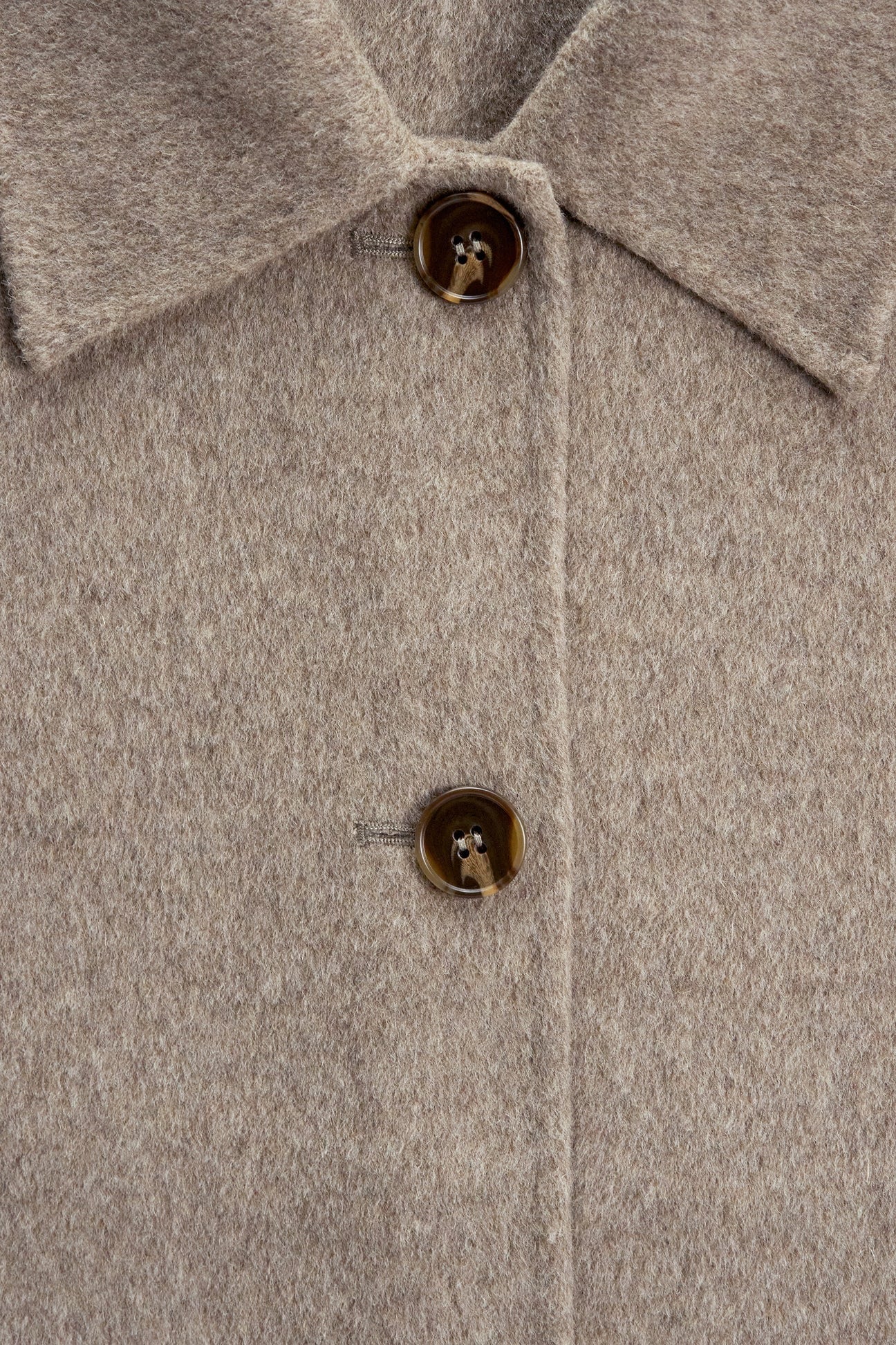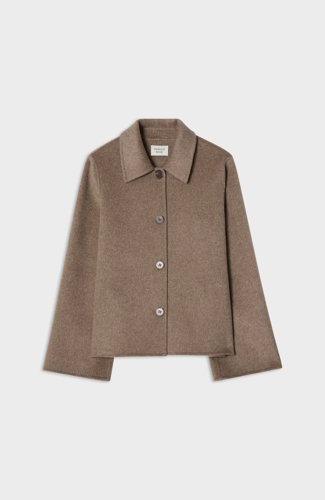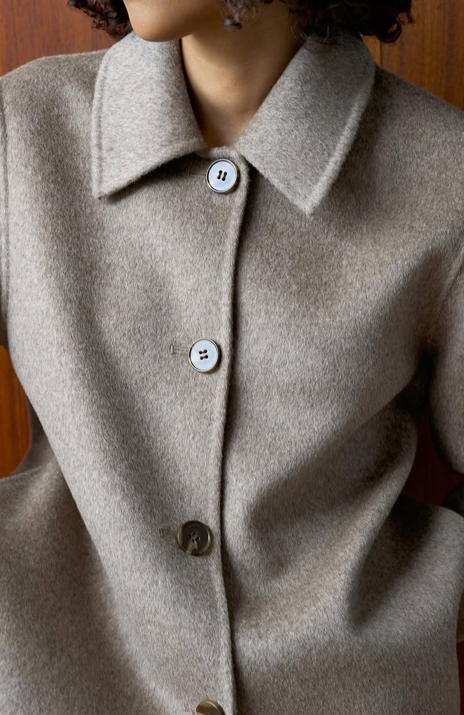 Coline-jackan är sydd i 100 % ull och har en kort, boxig passform med breda ärmar, skjortkrage och ton-i-ton-knappar i horn. En modern och värmande lager-på-lager-jacka med stilren attityd.