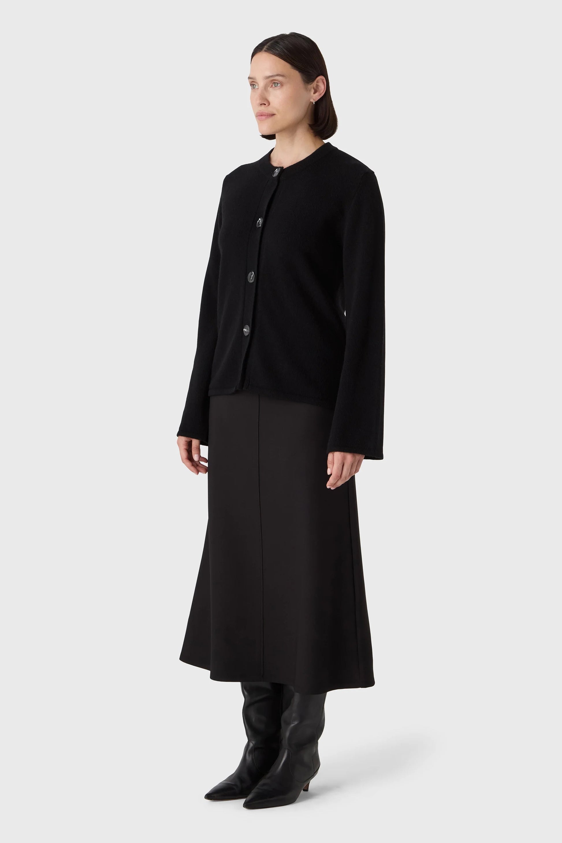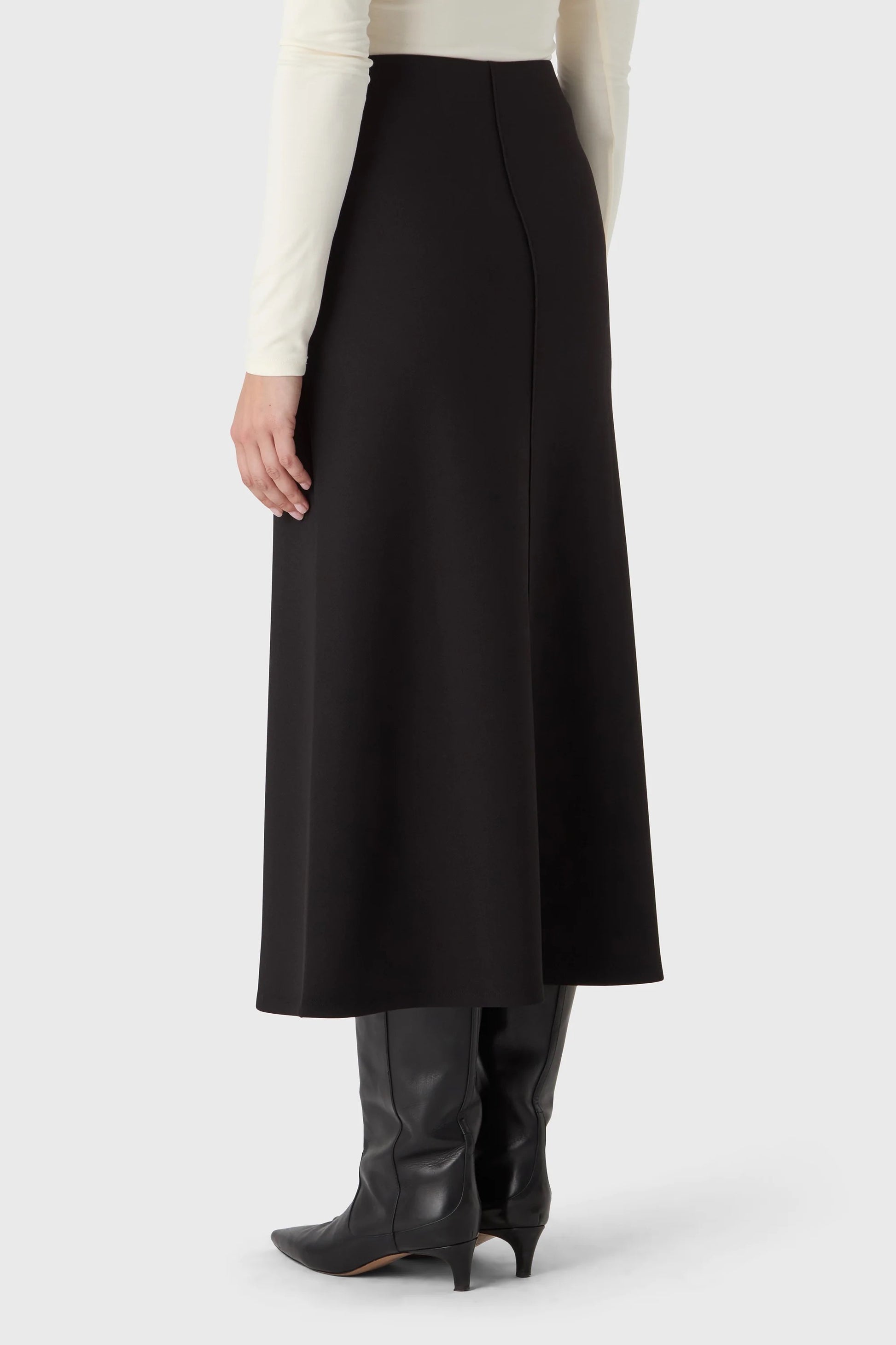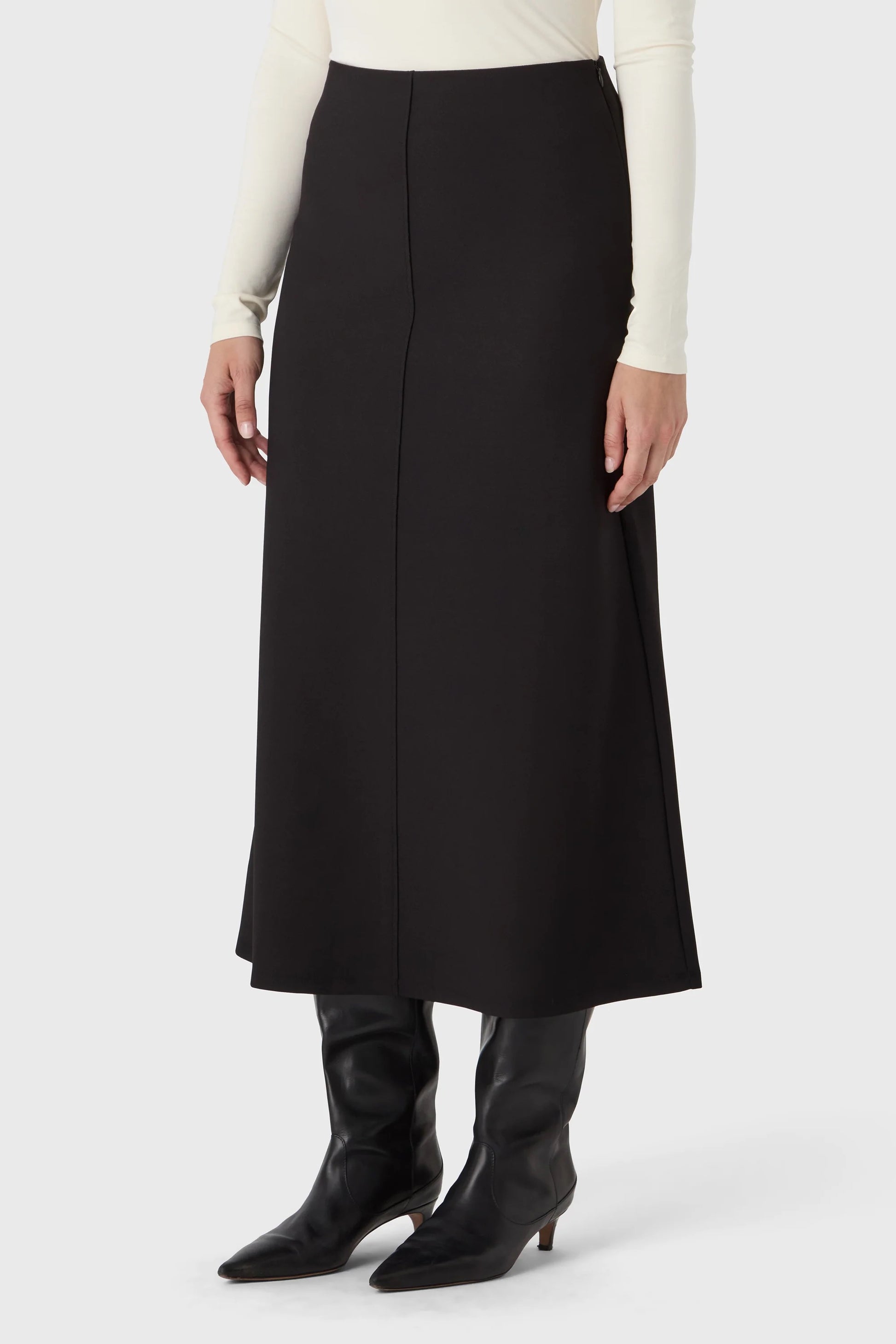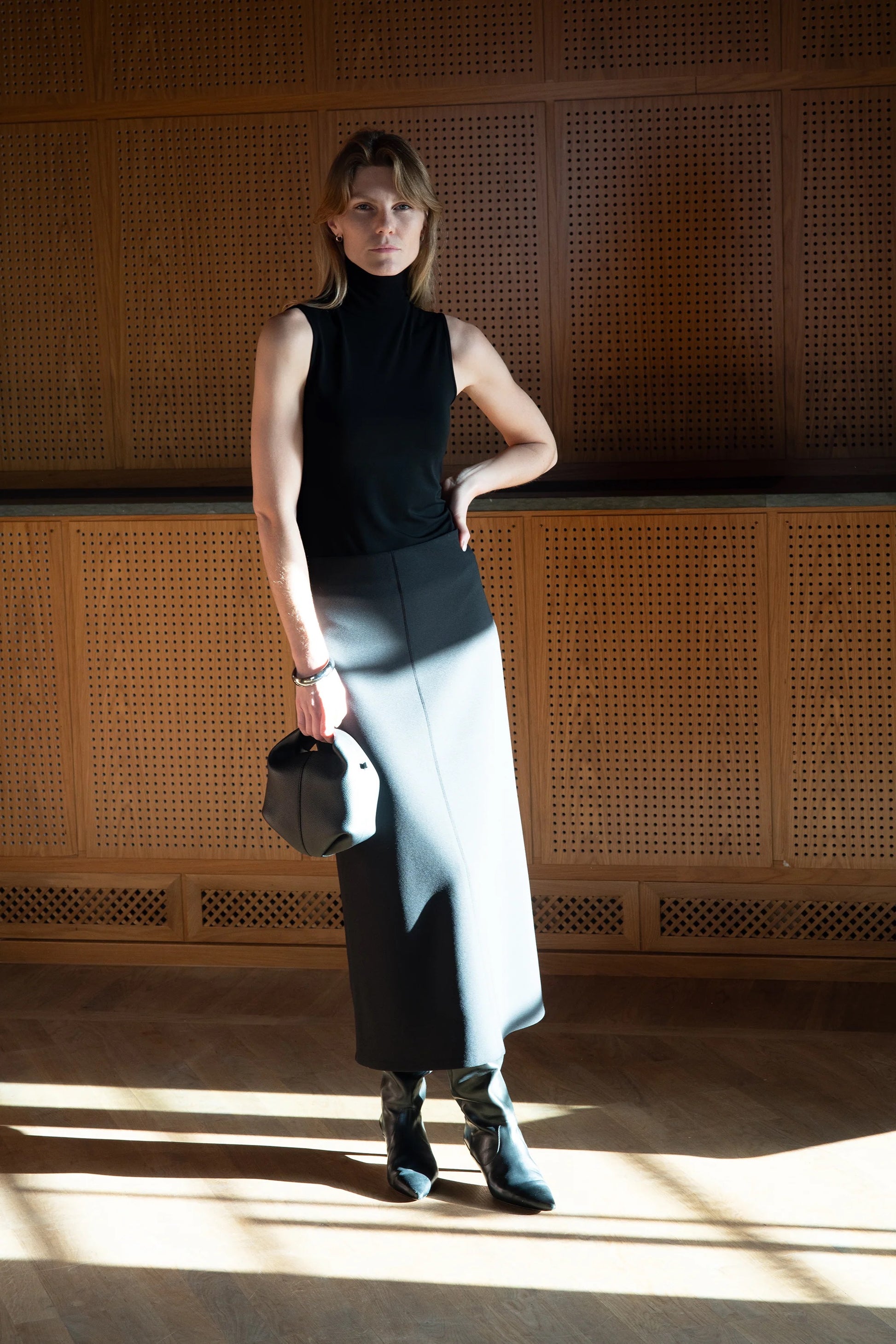 Rose-kjolen är sydd i superstretchmaterial som ger en mjuk, figurnära silhuett med fint fall. Modellen slutar strax under vaden och fungerar både som soloplagg och tillsammans med Pia-toppen som ett modernt set.
