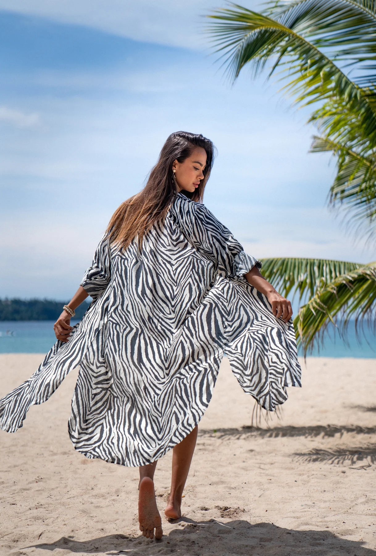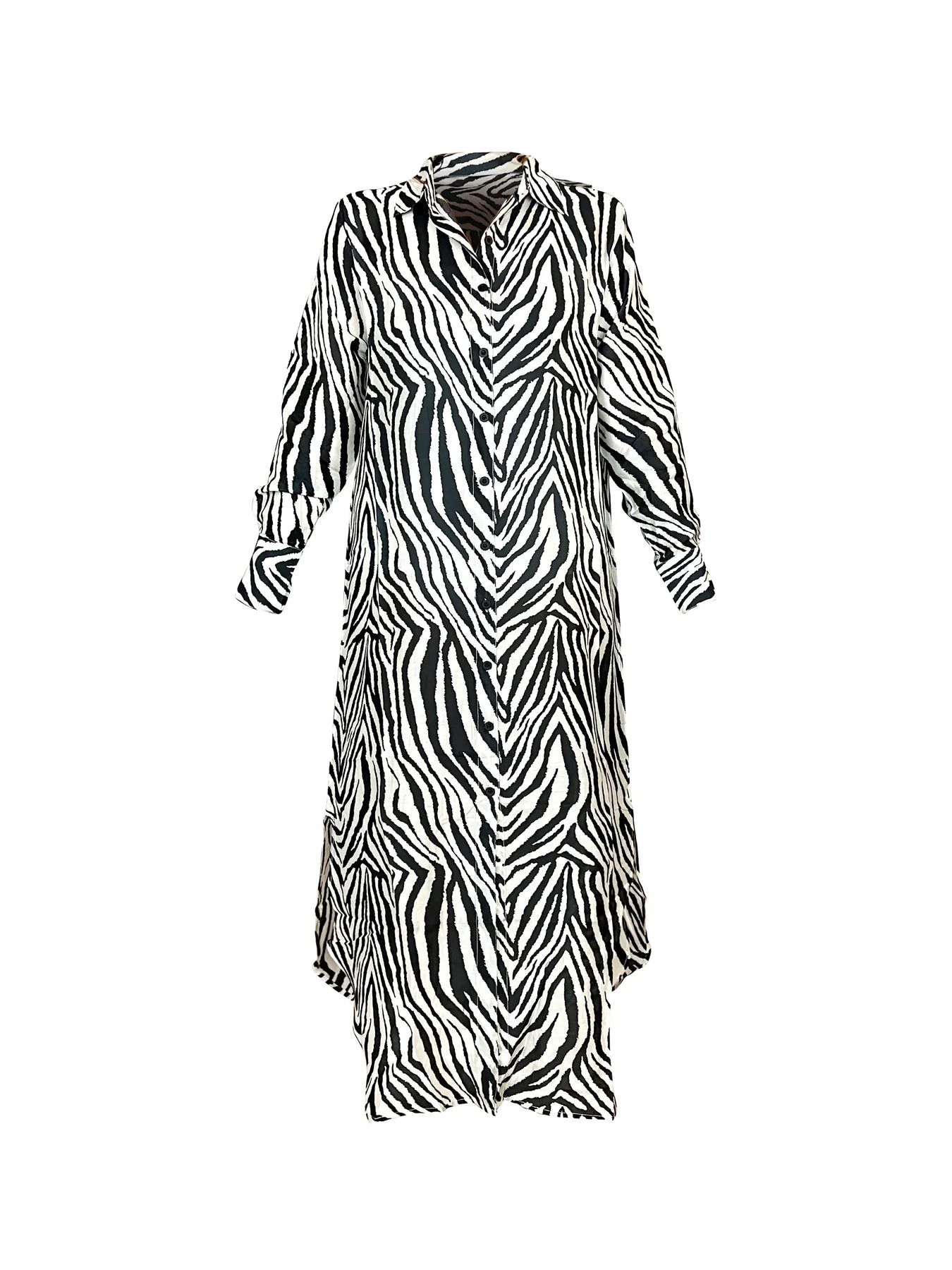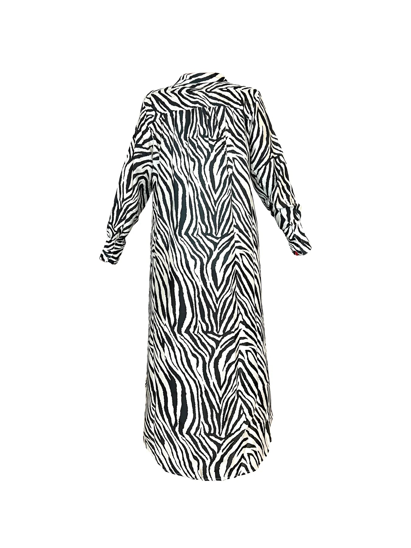 Zebramönstrad skjortklänning i mjukaste modal, med knappar i svart hela vägen upp. Skjortkrage och manchetter på den långa ärmen. 3/4 längd.