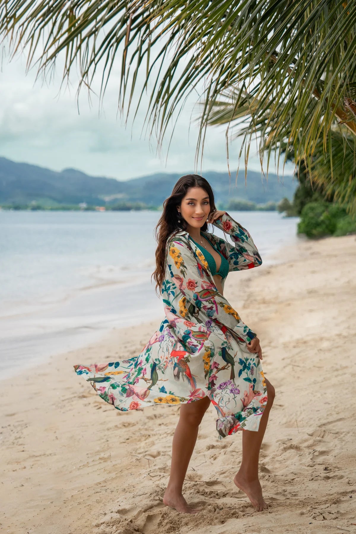 Hummingbird är ett vackert exklusivt Kaanda mönster med fåglar och blommor i ljuvliga färger. Klänningen är i mjukaste modal och knäpps framtill och på manschetten. Storleken är generös och med slits i sidan och rundad kant är det bekvämt att röra sig. Vacker till stranden eller vid pool kanten, men kan också bäras öppen med tex läderbyxor och boots till höstens storstads äventyr...