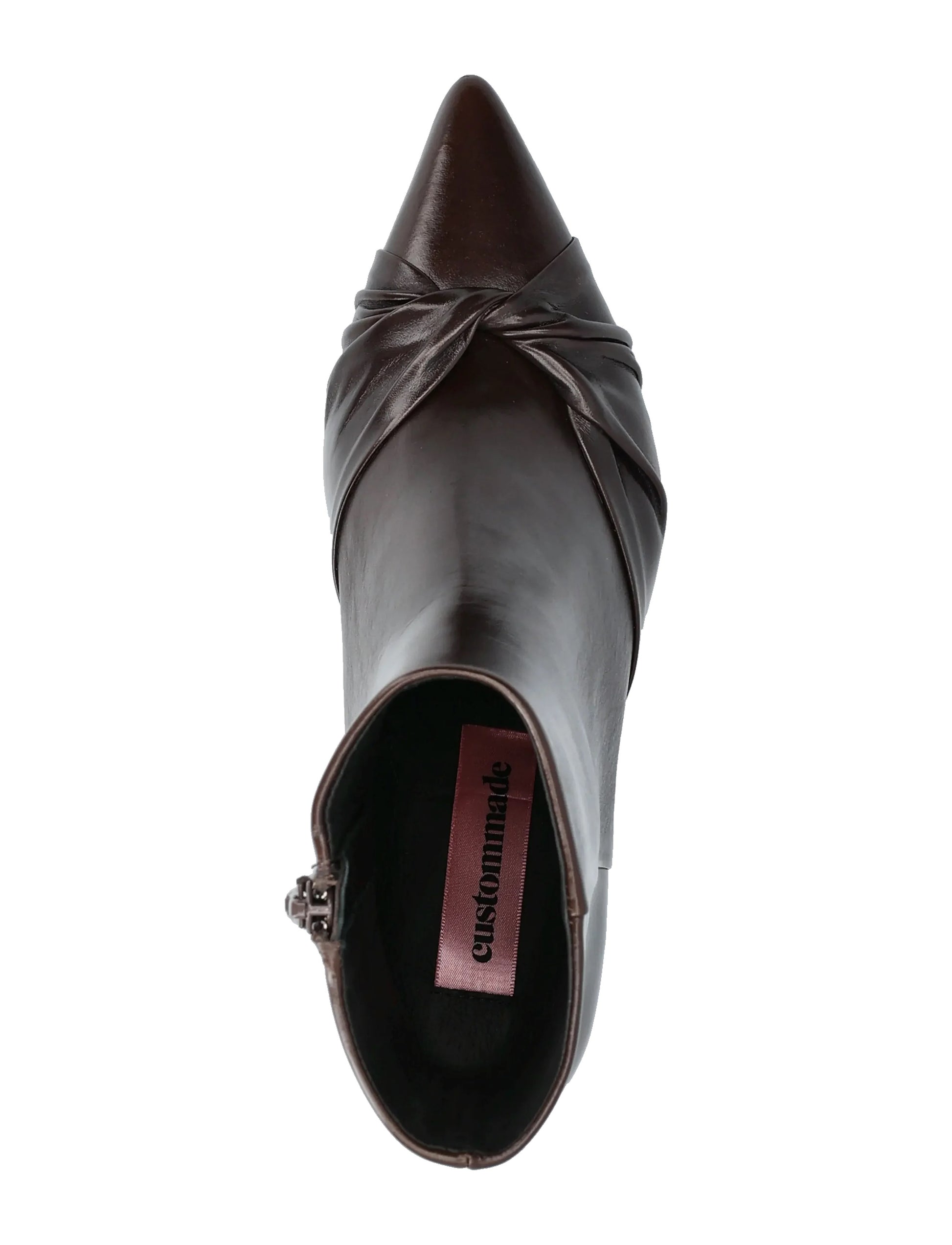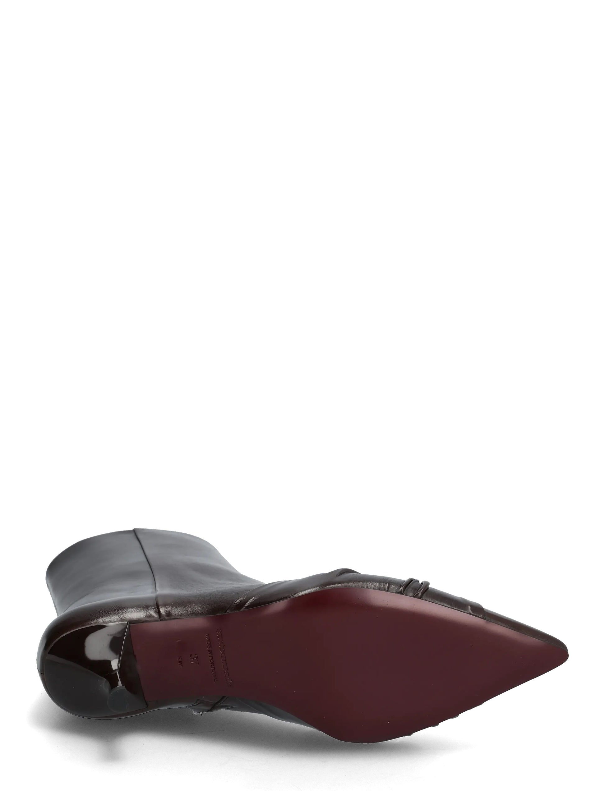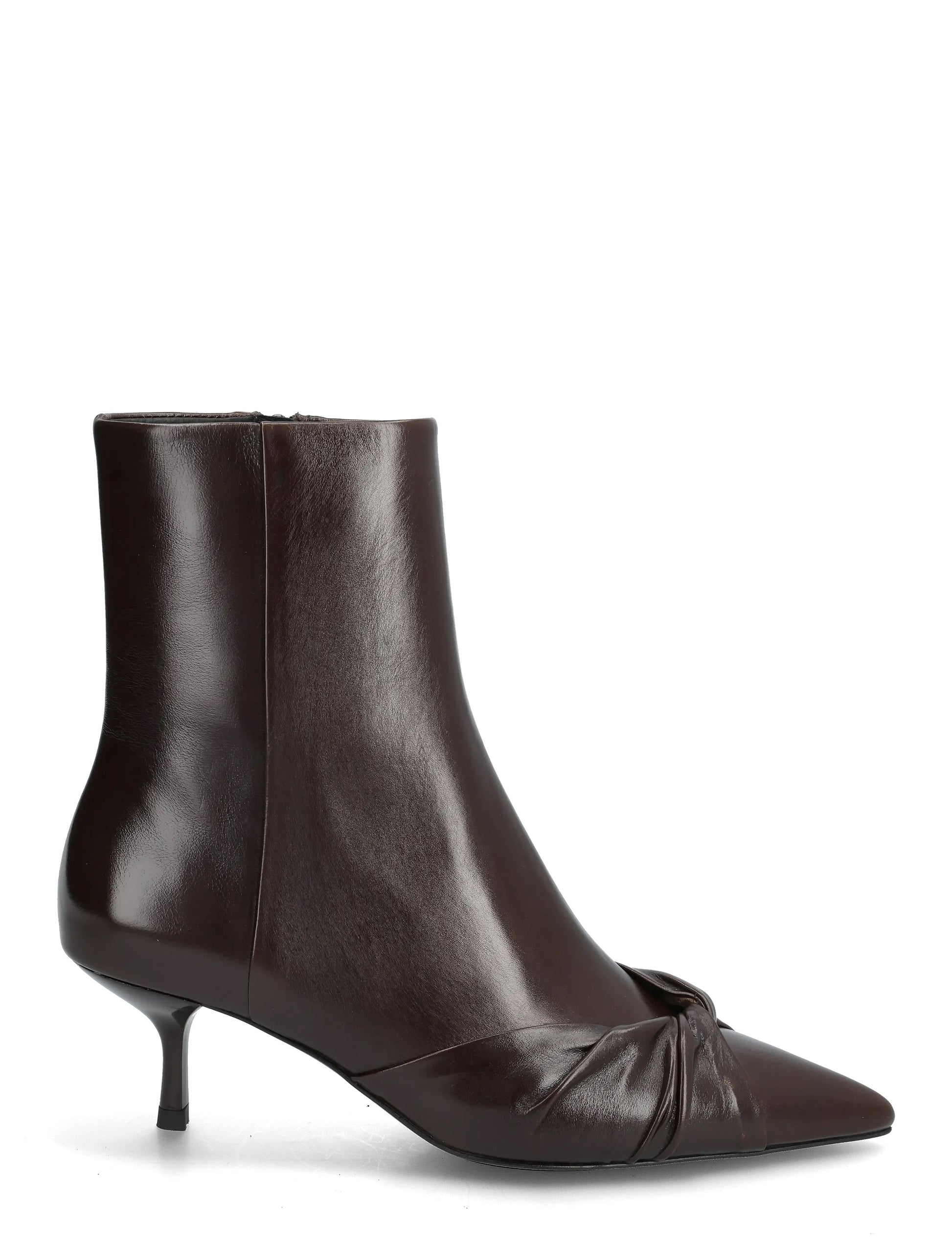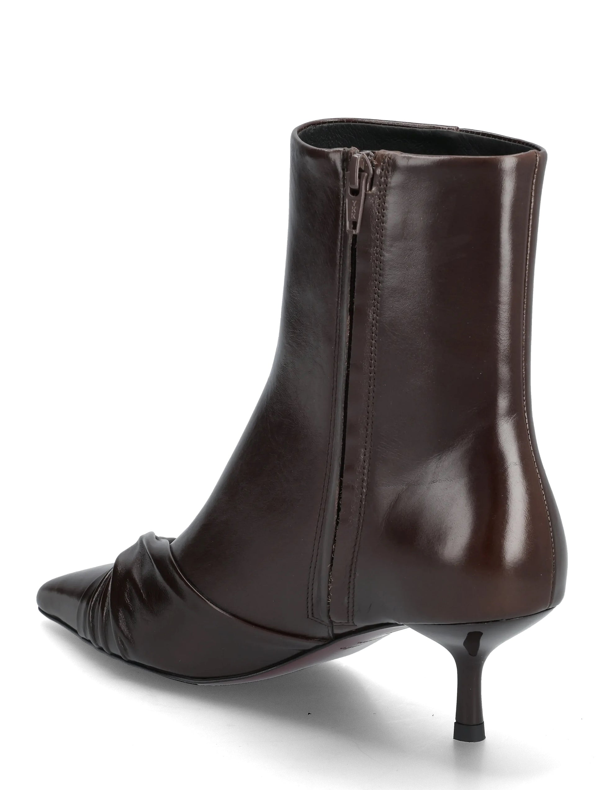 En läderdetalj ger en sofistikerad twist till denna låga bootie. Den eleganta silhuetten kompletteras av en subtil klack, vilket gör den till ett mångsidigt val för olika tillfällen.